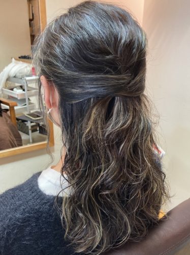 ご近所のお友達のA様。 ベースの髪の毛は染めないで白髪をぼかしていきました。 ブリーチで細かくウィービングをし…