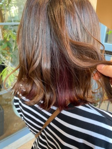 こんにちは!武蔵小金井店の工藤です。 全体はベージュ系カラーの白髪染めでインナーにアップルレッド+ピンク をい…