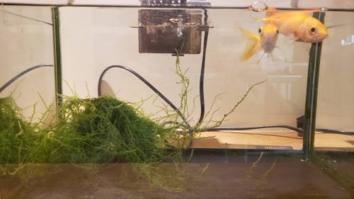 こんにちは!武蔵小金井店のごとうです。 武蔵小金井店では金魚を2匹飼っています。 同じ水槽の中に…