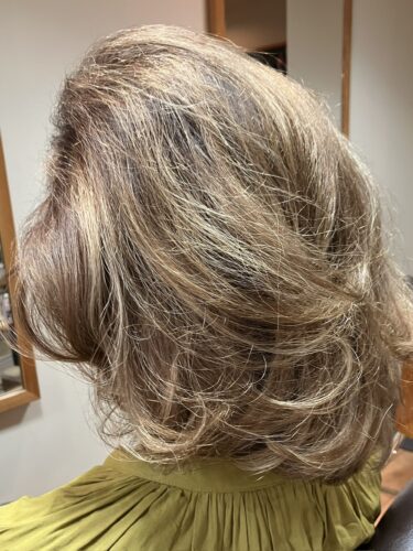 白髪率90%ぐらいのお客様です。 ベースも明るめのカラーで全体に太めのハイライトを入れて立体的か…